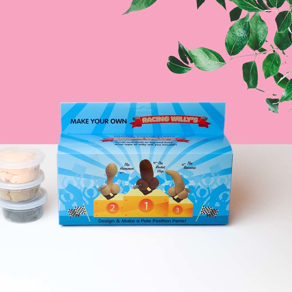 Racing Willies is the most perfect combination of art and sport there has ever been. First, you and up to two mates use putty to sculpt willies in the shape and size of your choosing. Then, place them on their platforms, wind up their feet and watch them go!